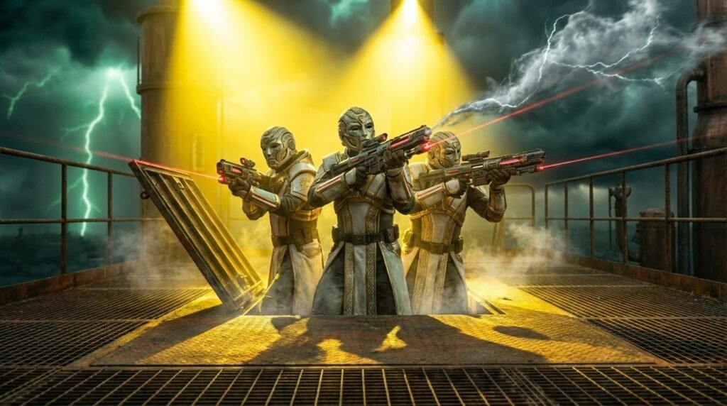 Five figures in the pristine, gold-trimmed armor of the Religious Guard—The Purifiers—had flanked the access hatch. Their plasma rifles were raised, the safety locks clicking off in unison.